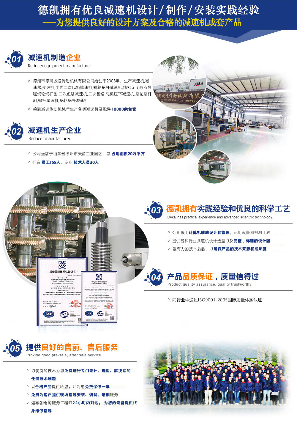 德州市德凱減速傳動機械有限公司,生產(chǎn)減速機,減速器,變速機,平面二次包絡(luò)減速機,蝸輪蝸桿減速機,精密無間隙雙導(dǎo)程蝸輪蝸桿副,二次包絡(luò)減速機,蝸輪蝸桿,軋機壓下減速機,蝸輪蝸桿副,蝸桿減速機,蝸輪蝸桿減速機,公司占地面積20萬平方,員工155人,技術(shù)人員30人,年生產(chǎn)各類減速機及配件18000余臺套。在同行業(yè)中通過了ISO9001質(zhì)量管理體系認(rèn)證。公司設(shè)備齊全、技術(shù)力量強大、檢測手段完善,引進國外大型數(shù)控二次包絡(luò)機床GJK75加工數(shù)控4臺,可加工到800二次包絡(luò)蝸輪蝸桿。引進漢江S7732蝸桿磨床3臺,精度可達5級。公司擁有輝光離子氮化爐4臺,經(jīng)該設(shè)備氮化后可提高蝸桿表面硬度、耐磨性高、提高疲勞強度、變形量小、耐蝕性、...
